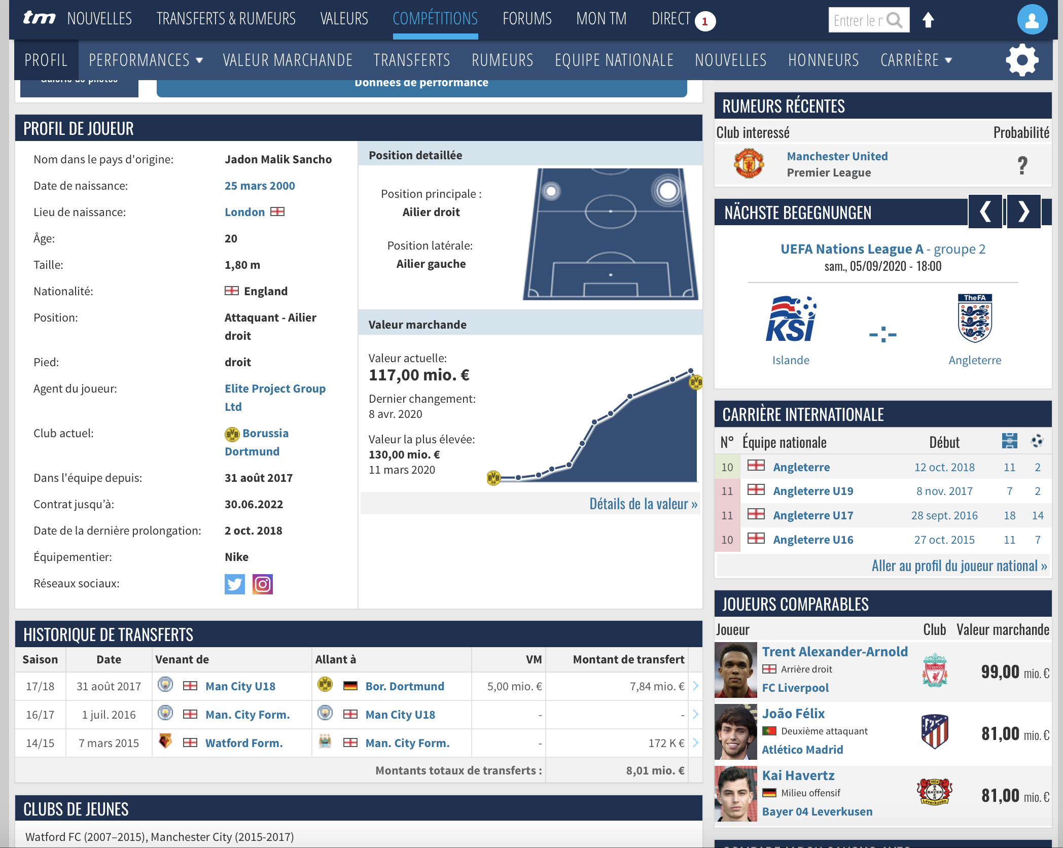 - Une fois la vérification effectuée, on effectue quelques recherches sur le joueur / coach / club, sujet de l’article. Pour cela, on peut utiliser des sites internet comme Transfermarkt ou des applis et autres sites (One Football pour ma part).